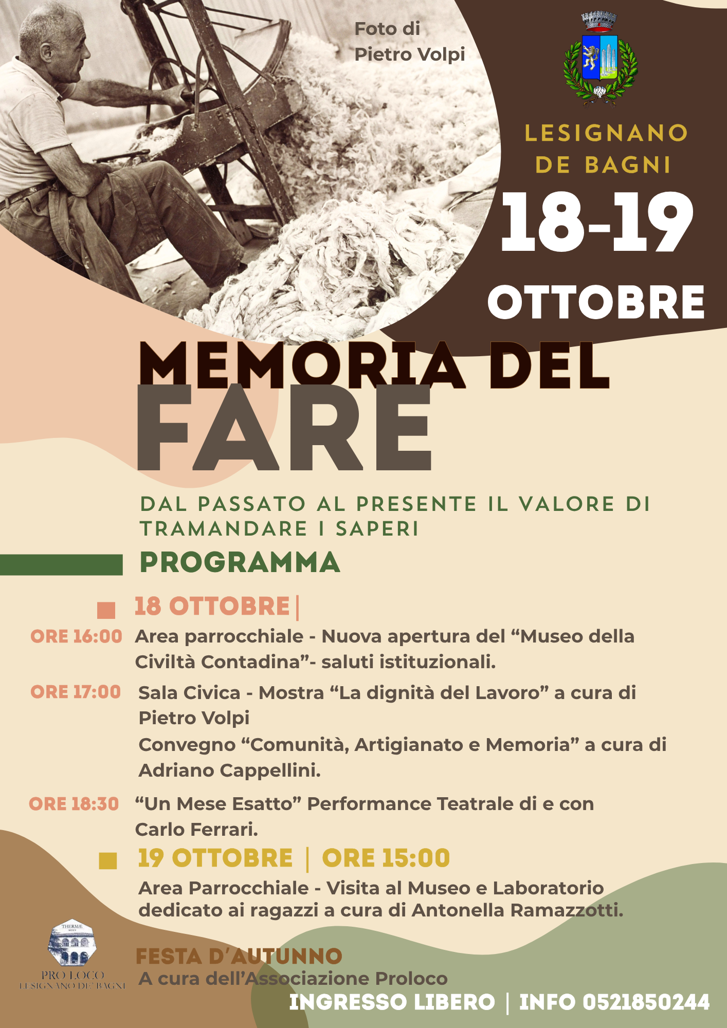 Gli Assessorati al Turismo e alla Cultura presentano "Memoria del Fare – Dal passato al presente il valore di tramandare i saperi", una rassegna nata per valorizzare le tradizioni artigianali, i mestieri e la memoria della nostra comunità. In due giornate ricche di appuntamenti – tra inaugurazioni, mostre, convegni e laboratori – il territorio offre l’opportunità di riscoprire le radici del lavoro e del saper fare, coinvolgendo adulti e giovani in un percorso di conoscenza e condivisione. Un invito a partecipare per preservare, insieme, il patrimonio culturale che ci unisce. Ingresso libero.